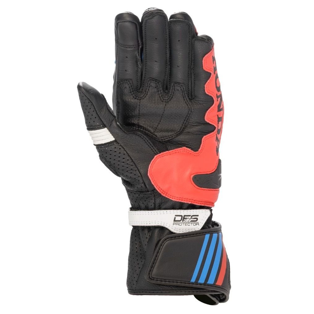 Sur le plan sécurité, les Alpinestars HONDA GP PLUS R V2 ne font pas semblant. Certifiés CE EN13594 Niveau 1KP, ils cochent toutes les cases importantes pour un gant à vocation sportive. Le dessus de la main en cuir de bovin assure une bonne résistance à l’abrasion, tandis que la paume en cuir de chèvre est épaissie et renforcée aux zones sensibles. On retrouve un pont de doigt breveté entre le troisième et le quatrième doigt, pour éviter le retournement et la torsion en cas de glissade : un détail qu’on espère ne jamais tester, mais qui peut clairement faire la différence. Les renforts latéraux avec curseur de paume en PU jouent le rôle de fusible en cas de chute, en limitant les chocs directs.