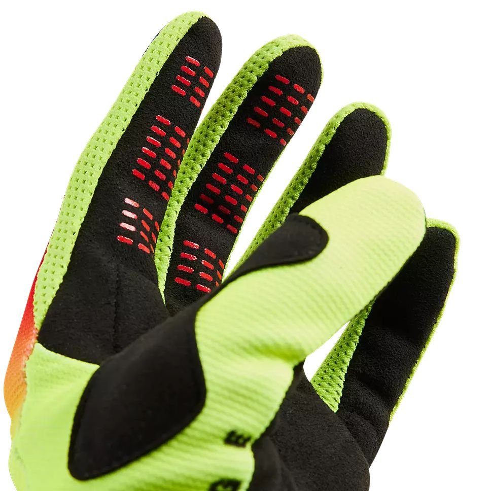 Côté architecture, les gants motocross Fox 180 KOZMIC suivent la recette classique du gant tout-terrain moderne : paume monocouche en Clarino, dos de main souple, et renfort léger sur le poignet. Le néoprène moulé à compression au niveau du poignet apporte une touche plus premium, en offrant une coupe bien propre quand le gant est fermé. La fermeture Velcro est simple mais bien dimensionnée, facile à manipuler même avec l’autre gant déjà en place. On note aussi la présence de grip silicone sur les doigts, avec un motif sobre mais efficace. Ces impressions apportent un petit côté tech au design global, sans surcharger visuellement. Les dessins sublimés ont l’avantage de ne pas s’écailler dans le temps, même après lavage répété, ce qui est un vrai plus pour les maniaques du look. En résumé : un design Fox fun, lisible et cohérent, plus orienté image et ergonomie que sophistication de matériaux.