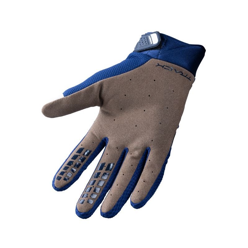 Dès qu’on enfile les gants Kenny TRACK 2023, on comprend leur philosophie : être oubliés une fois sur la moto. La coupe est près de la main, avec un volume globalement ajusté qui limite les plis dans la paume. La matière synthétique, assez souple, accompagne bien les mouvements des doigts, ce qui est crucial pour garder un bon dosage de frein et d’embrayage. Le renfort au niveau du pouce est un vrai plus pour le confort : sur les longues sessions, il réduit nettement les frottements contre la poignée et retarde l’apparition des ampoules. Pour un gant cross, qui doit encaisser des manches répétées, c’est loin d’être un détail. On sent bien aussi que la paume en clarino, plutôt fine, offre un contact précis avec les poignées, ce qui plaira aux pilotes qui aiment sentir la moto « en direct » sans épaisseur superflue.