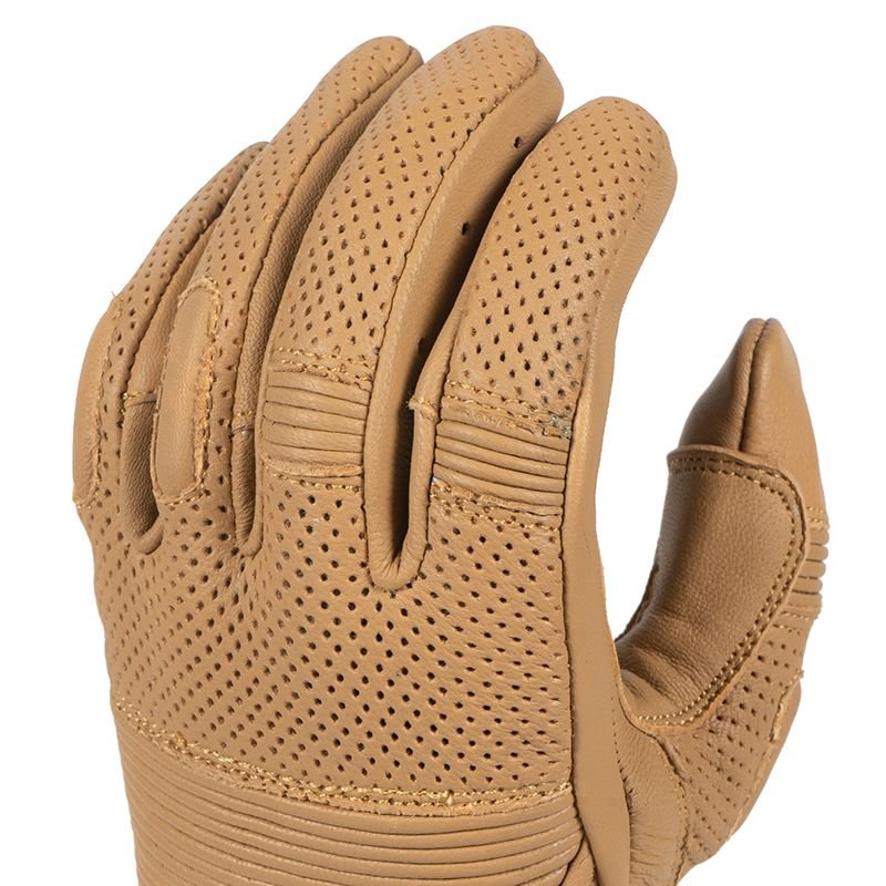 Visuellement, les DXR SOUNDTRACK PUNCHER misent sur la sobriété. Cuir de chèvre perforé, coupe courte, manchette discrète : ce sont des gants été en cuir qui s’intègrent parfaitement à un style urbain ou néo-rétro. On n’est pas sur un design racing ultra agressif, plutôt sur un esprit custom / roadster propre, avec juste ce qu’il faut de nervures et de soufflets pour donner du relief. Les perforations sont bien réparties sur le dessus de la main et les doigts, sans transformer le gant en passoire visuelle. C’est propre, équilibré et lisible, surtout pour un usage quotidien. Aucune surenchère de logos : la marque DXR reste discrète. On sent que le cahier des charges visait un gant à porter tous les jours, sans se poser de questions de style. Résultat : ça s’accorde à peu près avec tout. Et ça, sur un équipement moto, c’est loin d’être anodin.