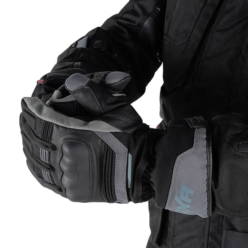 Visuellement, les DXR TEKAPO jouent la carte de la sobriété. On est loin du gant racing flashy : ici, place à un look discret, presque « utilitaire », qui colle bien au programme hivernal. Le dessus de la main en polyester 600D donne immédiatement une impression de robustesse, avec un tissage serré et des coutures apparentes mais propres. La paume en cuir de chèvre apporte une touche plus premium, tout en restant dans un style très fonctionnel. Les zones renforcées sont visuellement bien marquées sans être agressives, ce qui permet de porter ces gants aussi bien sur un roadster que sur un trail ou un scooter GT. Bref, c’est du sobre, mais pas tristounet pour autant.