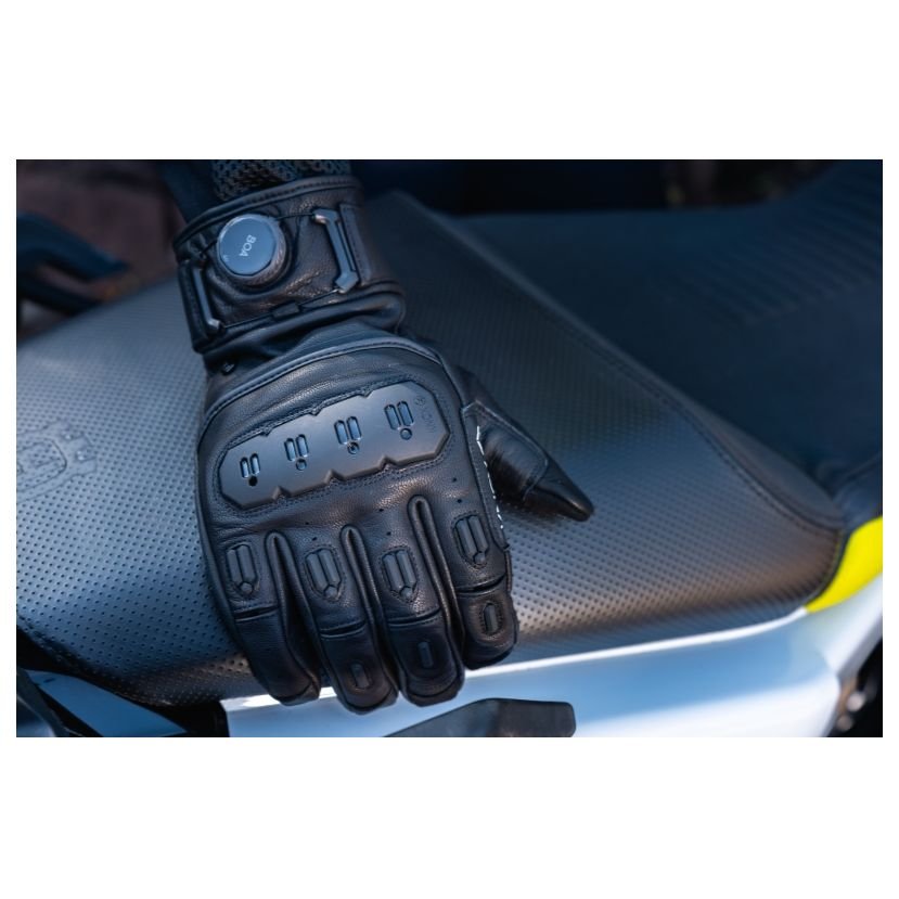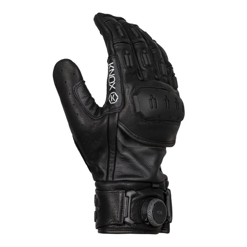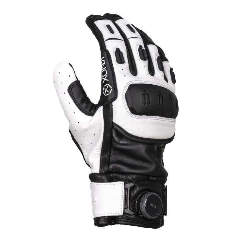 Côté finitions, Knox reste fidèle à sa réputation. Les coutures sont nettes, régulières, sans fils qui dépassent – et surtout, les extrémités de doigts sans couture se sentent immédiatement une fois enfilés. Pas de gros bourrelet qui gêne au bout du doigt quand on freine ou qu’on manipule les commodos. Le système BOA® au poignet est parfaitement intégré : le cadran ne gêne pas, ne cogne pas sur le guidon et donne un vrai look « équipement haut de gamme ». Les renforts SPS au bas de la paume sont imposants mais bien dessinés, ils ne cassent pas trop la ligne du gant. On devine que chaque zone de cuir, chaque insert TPR a été placé avec une idée précise derrière. Ce n’est pas le gant le plus discret du marché, mais pour un usage roadster / supermot’ / street, il colle parfaitement à l’ambiance.