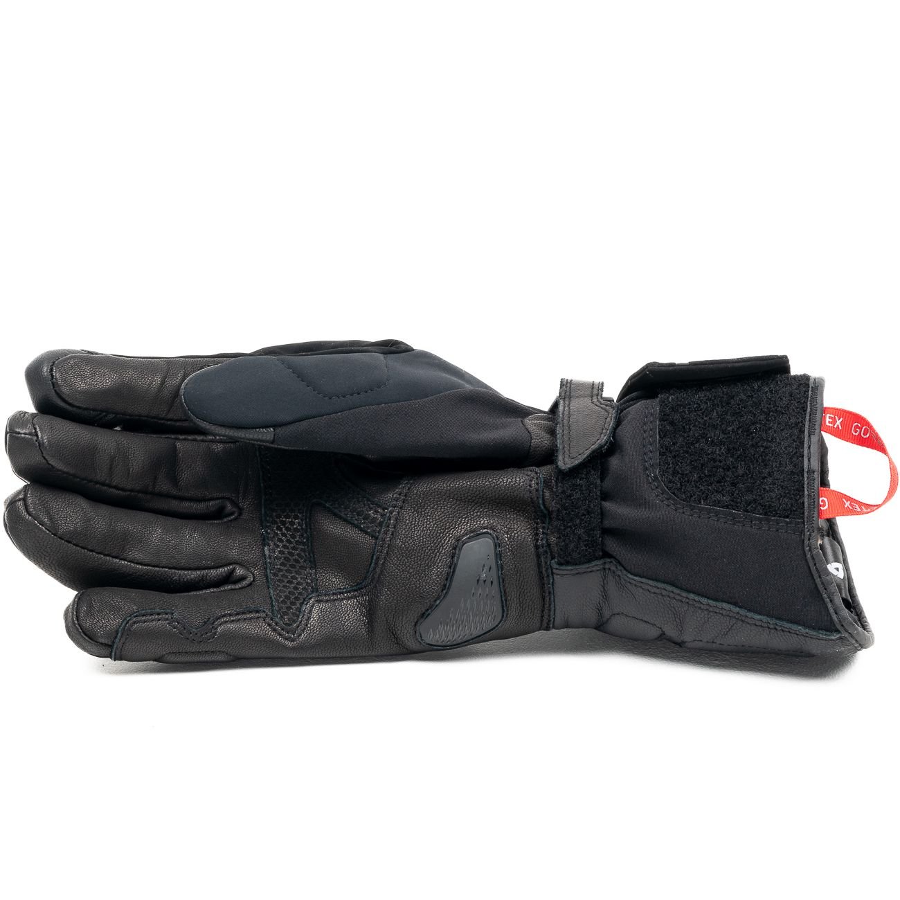 Les finitions sont globalement très propres : coutures régulières, pas de fils qui dépassent, ajustements cohérents. La manchette longue enveloppe bien la manche du blouson, avec un poignet extensible et un PU floqué qui aide à mieux gérer l’eau. On sent que Rev’it a pensé pratique : dragonne de serrage, velcro auto-agrippant bien dimensionné, raclette à visière intégrée, doigts extensibles pour limiter la sensation de blocage. Rien de révolutionnaire individuellement, mais l’ensemble respire le produit mature. Bref, c’est plus un outil de rouleur qu’un accessoire de vitrine, et ce n’est pas un défaut.